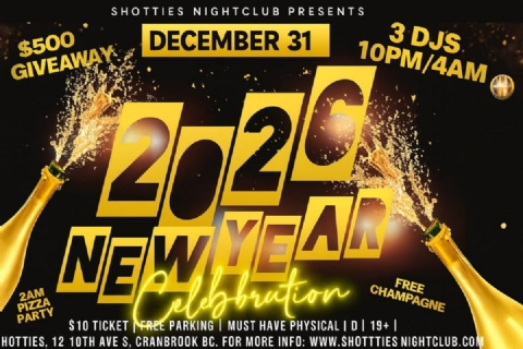 Ring in the New Year loud, bright, and unforgettable at Shotties Nightclub’s NYE ’26 Celebration. Cranbrook’s biggest New Year’s Eve party kicks off at 9:00 PM with a stacked DJ lineup keeping the dance floor moving all night long. Celebrate the countdown to 2026 with a free champagne toast at midnight, a $500 cash giveaway, and nonstop party anthems. Fuel up at the 2:00 AM pizza party and keep the energy going until the early hours. Tickets are limited and expected to sell fast. This is a 19+ event and valid physical ID is required.