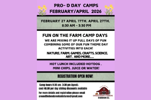 Around the Bend Creekside Farms is hosting Pro-D Day Camps on select no-school days in February and April, offering full days of fun on the farm for kids ages 6 and up. Camp runs from 8:30 AM to 3:30 PM and features a mix of themed activities including games, crafts, scavenger hunts, outdoor play, farm experiences, science, art, and more. A hot lunch is included, featuring a hotdog, mini chips, and juice or water. The cost is $40 per day, with sibling discounts available. Registration is now open. For more information or to register, email aroundthebendcreeksidefarms@gmail.com or send a message through their social channels.