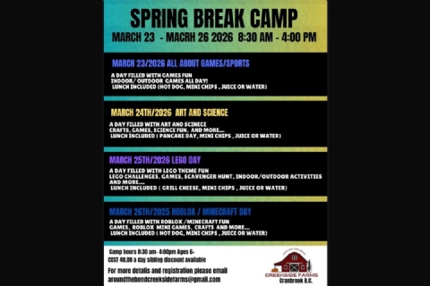 Around the Bend Creekside Farms is hosting Spring Break Camp from March 23 to March 26, 2026, offering four full days of themed fun for kids ages 6 and up. Camp runs daily from 8:30 AM to 4:00 PM, with a different theme each day including Games and Sports, Art and Science, LEGO Day, and Roblox and Minecraft Day. Each day includes indoor and outdoor activities, games, crafts, scavenger hunts, and more, plus lunch provided. The cost is $40 per day, with sibling discounts available, and families may register for individual days or all four days. Registration is now open. To register or learn more, email aroundthebendcreeksidefarms@gmail.com or send a message.