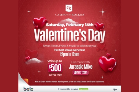 Celebrate Valentine’s Day at Casino of the Rockies with a full day of fun, prizes, and sweet surprises on Saturday, February 14! From 12:00 PM to 12:00 AM, enjoy Hot Seat Draws every hour for your chance to win up to $500 in Free Play, plus sweet treats throughout the day. The evening wraps up with live music by Jurassic Mike from 8:00 PM to midnight. Stop in, feel the love, test your luck, and treat yourself to a memorable Valentine’s Day celebration. Visit Guest Services for full terms and conditions.