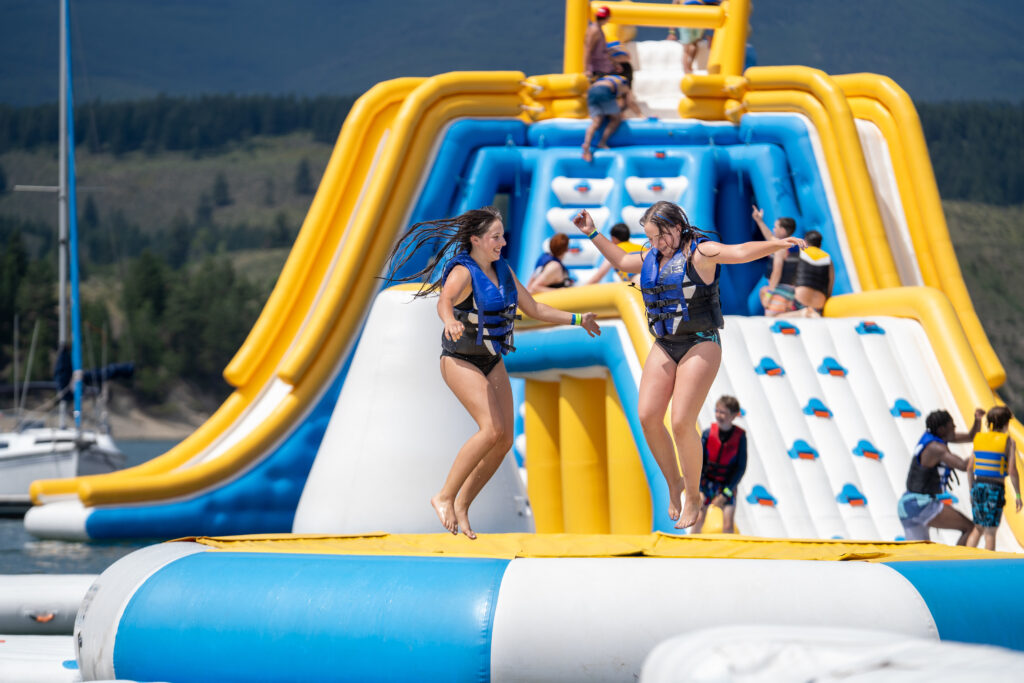 If your kids (or the kid in you) need even more excitement, Sunshine Marina’s floating Water Park is the place to be. Lake Koocanusa’s first and only giant inflatable aquatic playground has been a huge hit with families since it launched. A brand-new, even bigger setup was introduced in 2021, and new features are added regularly, including a 25-foot tall inflatable climbing tower and slide. Imagine a collection of bouncy castles and obstacle courses floating right on the lake: slides, jumping pillows, trampolines, swings, ramps, ladders are all connected for hours of slip-sliding, bouncing, and splashing fun.