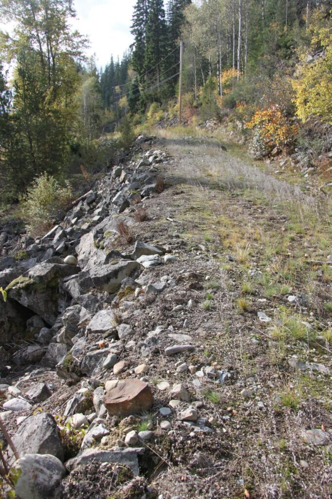 This photo shows what is believed is one of few remaining portions of the Dewdney Trail in the East Kootenay, south of Moyie and Irishman Creek. A hand-built rock wall and a distinctive four-foot-wide path are still evident.