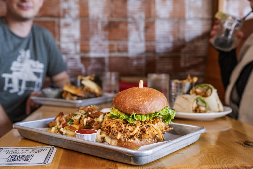 At Ella’s, the warm, colorful atmosphere is as welcoming as the food, and the Ol’ Fowl Chicken Sandwich brings a taste of the Caribbean to Cranbrook. A crispy, fried chicken breast seasoned with Jamaican spices sits atop a soft brioche bun, accompanied by a refreshing cabbage slaw, scotch bonnet aioli, and pickles. Each bite delivers a satisfying kick that combines crunch, heat, and flavour. For those looking to add a tropical twist to their burger experience, Ella’s has the perfect choice.