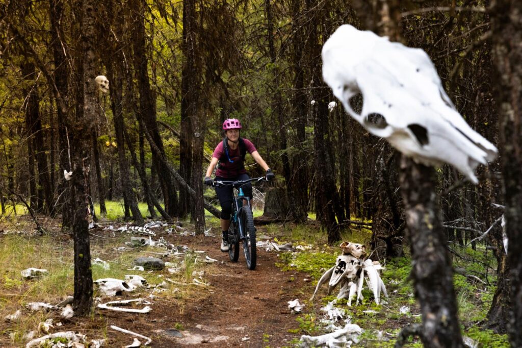 On day three in Cranbrook, the skies were cloud-covered, offering a welcome break from the heat of the sun as we geared up for one of the bigger rides of the trip. The plan was to ride Hobgoblin, a fun, flowy cross-country trail with some fun blue-tech descent sections and wicked views of the Steeples and the Kootenay River winding its way through the valley below. The ecosystem changed as we gained elevation while pedalling up the mixed bag of trails to get to Hobgoblin. The open forests with ponderosa pine gave way to Douglas fir and an understory full of wildflowers such as lupine and mariposa lilies. The trail itself felt remote as it rolled up and down over the top of the mountain, along an epic ridgeline, past a little lake, and through the goblin’s boneyard (don’t worry about missing it if you decide to ride this trail – you’ll know when you’ve arrived at the boneyard). At the end of Hobgoblin, there were a few options to get back to the bottom: we opted for a bit more of a climb and pedalled Upper Coaster to descend Yer Cheatin’ Heart for some fun flowy berms, then cruised on down Migor and Hillbilly Music for a quick rip back to the parking lot. The total ride distance was around 21 kilometres, which had us feeling tired, stoked to get some food, and ready to head back to camp for bed.