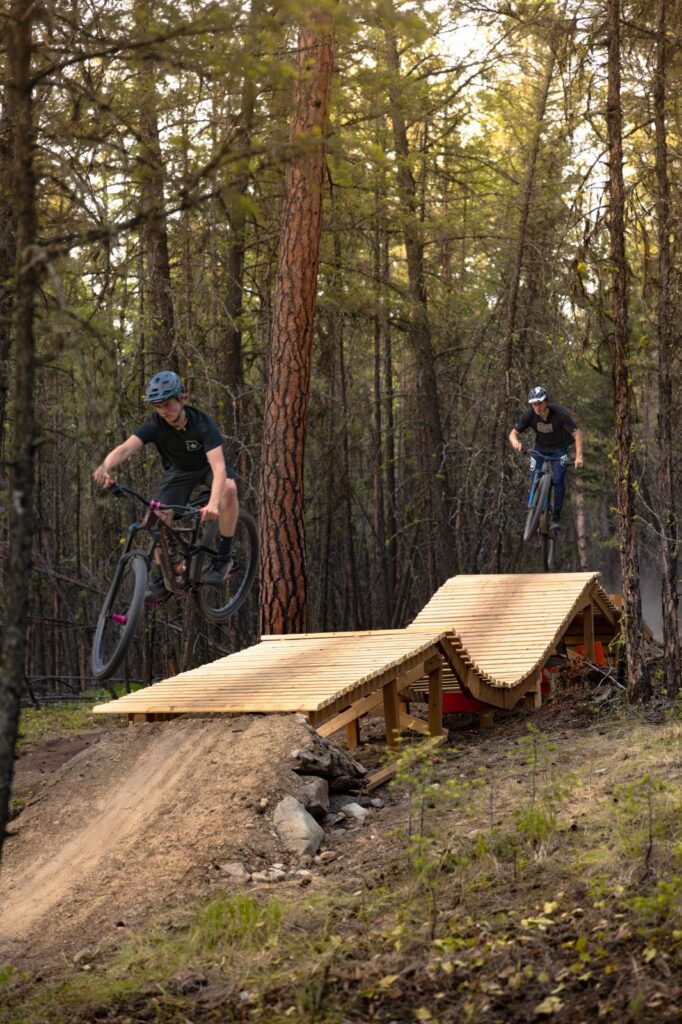 Eager to see as much as I could while I was in Cranbrook, I had a quick lunch and then met up with Tanner and Paul, two locals who work at the local bike shop, North Star Bicycle Co., and went for another ride to get into some of the spicier trails that Cranbrook has to offer. We climbed up Pilsit, Larry, and Windy Bluff to get to the top of Stunty, where we were rewarded with an epic view looking West over Cranbrook before dropping into the descent. Stunty was a rad mix of rock slabs, a few wooden features, a natural rock wallride, some steep n’ loose sections, and a healthy mix of jumps and drops. Though it is considered to be one of the hardest trails in the network, it felt like a true black. Tanner and Paul ripped down the trail as I did my best to keep up and yelled ahead a few times to ask them to stop and session a feature to take a photo. From the bottom of Stunty, we took a connector onto Green Chicken and, from there, rode More Poultry to the bottom. These two trails offered a rad mix of quick berms, jumps, drops, and wood stunts. After returning to the van, Chloe and I drove to Moyie Lake Provincial Park, where we had dinner and a campfire before bed.