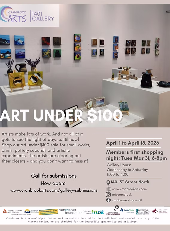 Discover affordable local art at the Art Under $100 Exhibition & Sale at Cranbrook Arts Gallery, running April 1 to April 18, 2026. This unique show features a wide range of small works, prints, pottery seconds, and creative experiments from local artists, all priced under $100.
