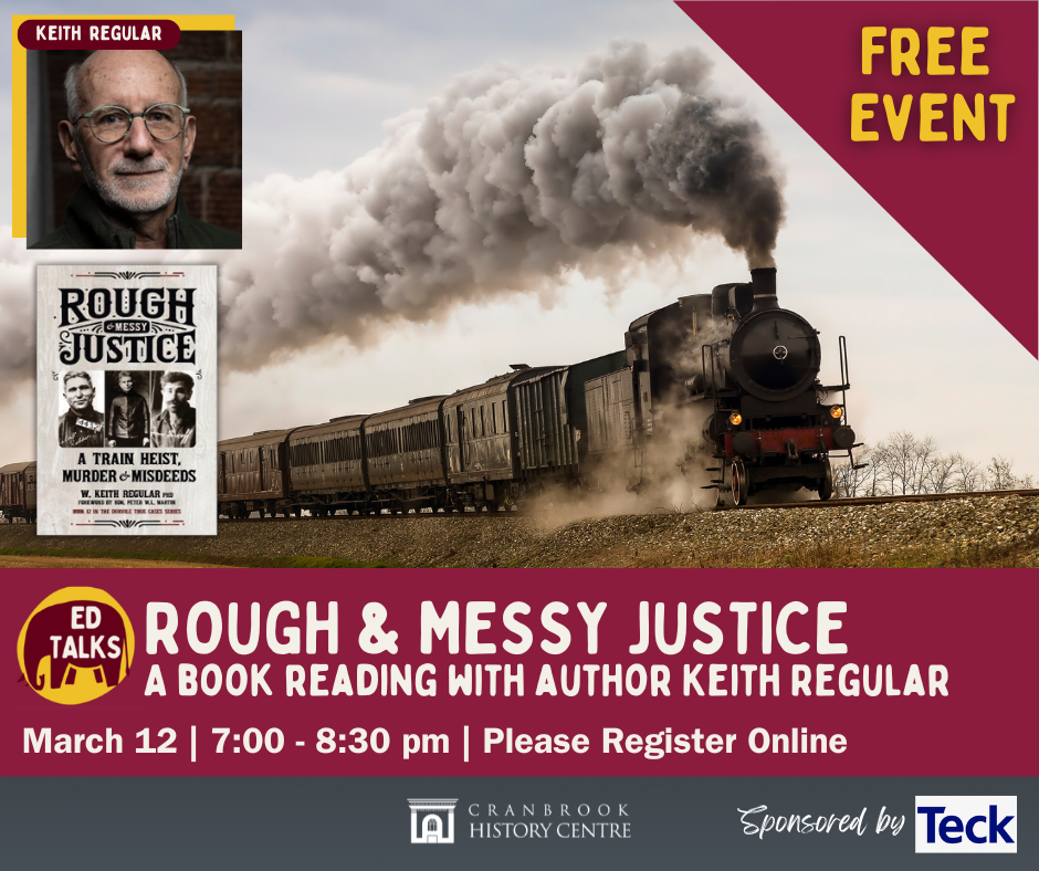Join the Cranbrook History Centre on March 12 from 7:00 PM to 8:30 PM for an engaging Ed Talk featuring Keith Regular, author of Rough & Messy Justice. The book explores the dramatic 1920 armed robbery of a CPR train in the Crowsnest Pass, culminating in a shootout at the Bellevue Café and a thrilling manhunt through the Rocky Mountains. Keith Regular, who holds a Master of Arts in History from the University of Calgary and a PhD from Memorial University of Newfoundland, specializes in early 20th-century legal history in Western Canada and currently lives in Cranbrook. Registration is required. If the event fills up, email [email protected] to be placed on the waitlist.