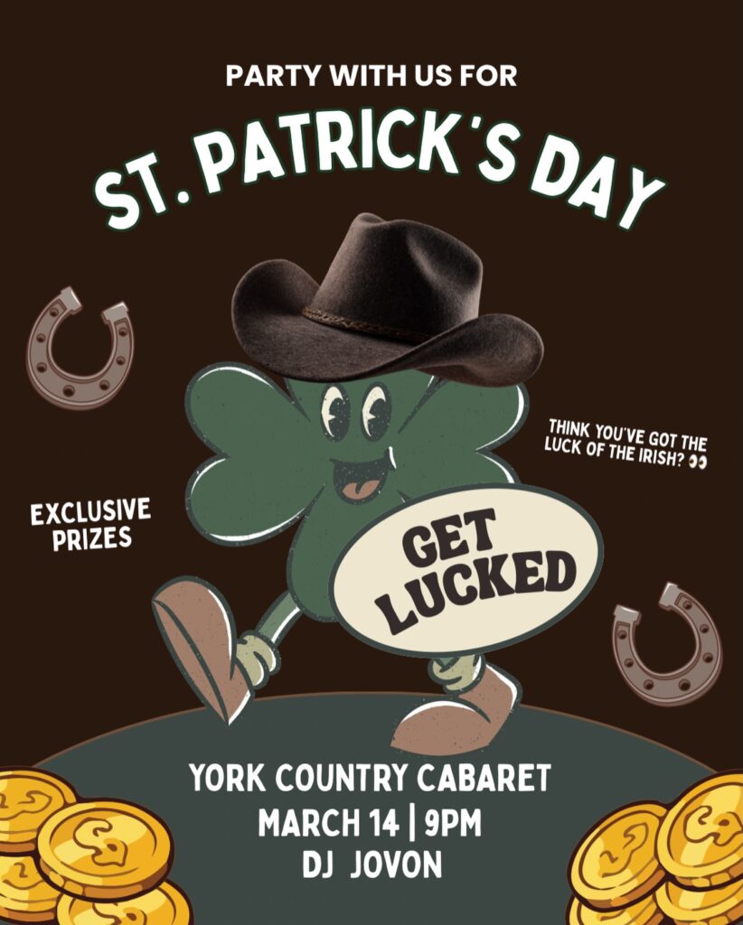 Celebrate St. Patrick’s Day at York Country Cabaret with the GET LUCKED St. Patrick’s Day Party on March 14 at 9:00 PM. This lively night promises great music, festive vibes, and the chance to win exclusive prizes throughout the evening.