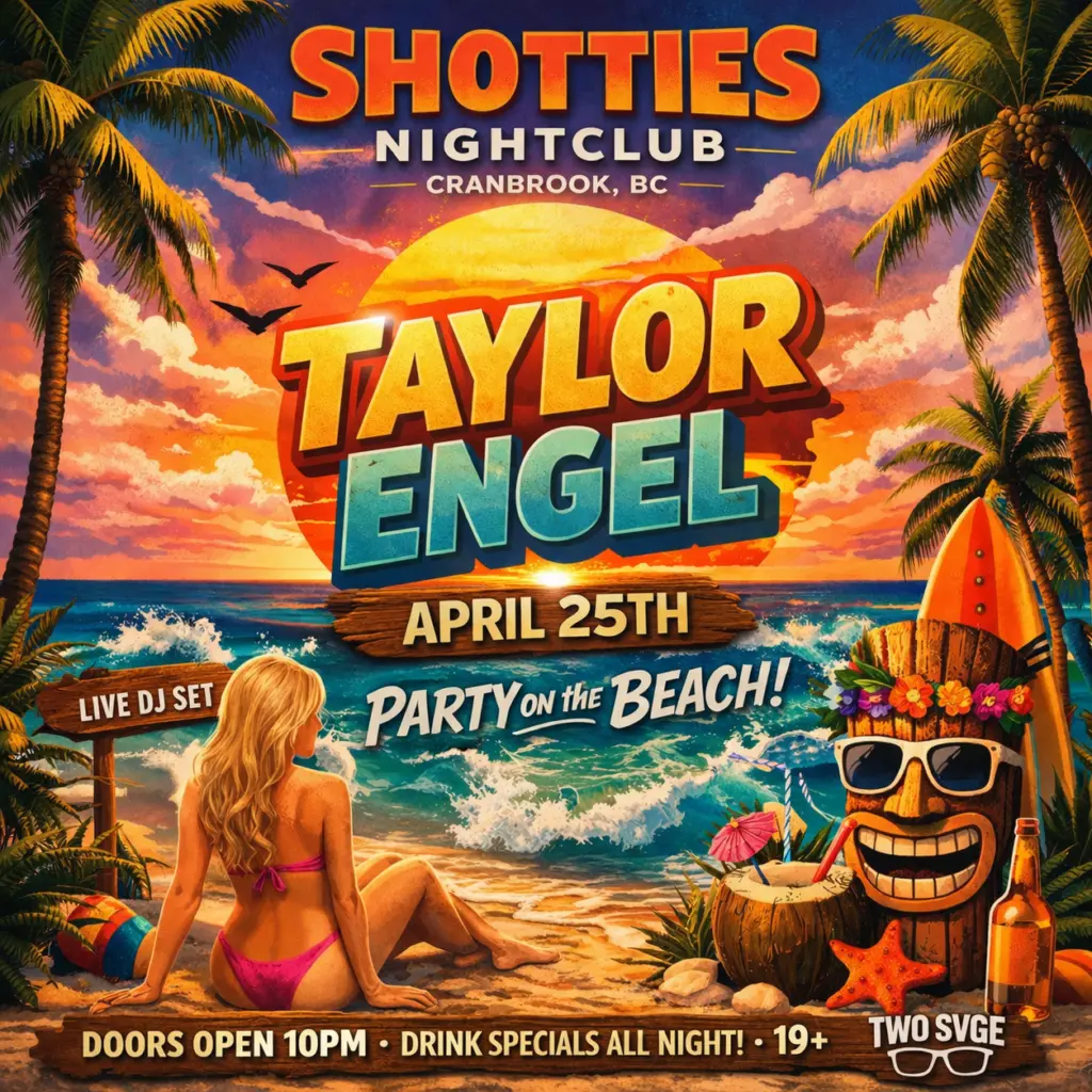 Shotties Nightclub presents Taylor Engel live for a tropical-themed party night in Cranbrook.